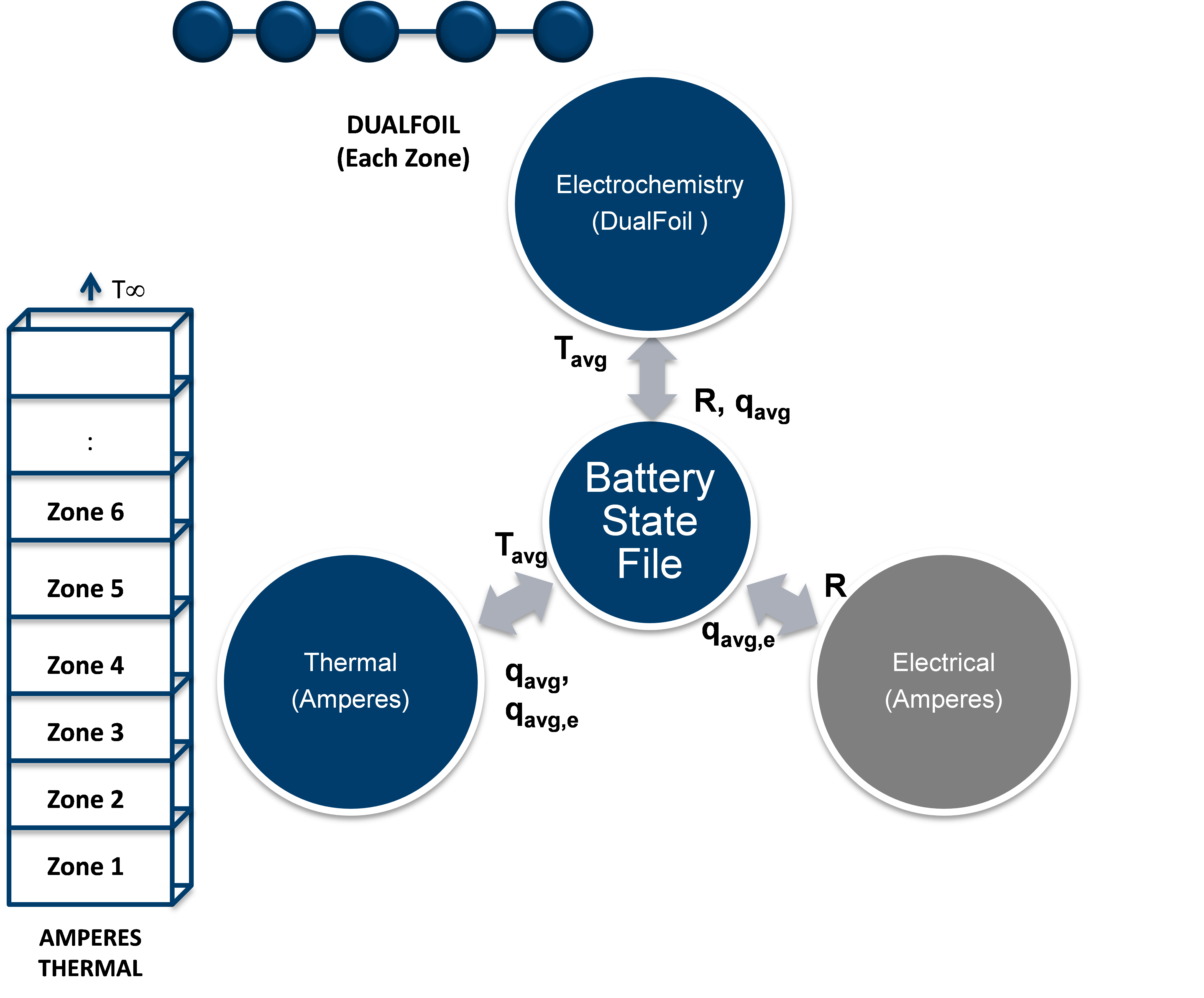 The battery state file for this example is schematically shown in Fig. 1. The unrolled cell domain is decomposed into zones along the axis based on the expect temperature gradients. Each zone calls its own version of DualFoil. The DualFoil calculations provide the heat source for each of the zones. The thermal component calculations update the temperatures for the each of the zones for the DualFoil calculations. The typical results from these simulations are shown in Fig. 2. As seen in the results, the solution deviates the most with one-way loose coupling and as we increase the degree of coupling (by exchange of information and also using more number of zones), the peak temperature approaches 80˚C – the solution from the fully coupled solution (Srinivasan and Wang 2003).